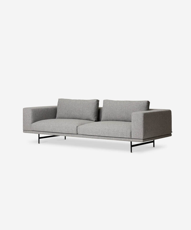 Sofa features a wide, angular shape with a wood and steel construction, carried by a slender frame of powder-coated steel. One cushion per unit is included. This version is a 3-seater configuration upholstered in a light grey or dark grey.